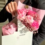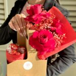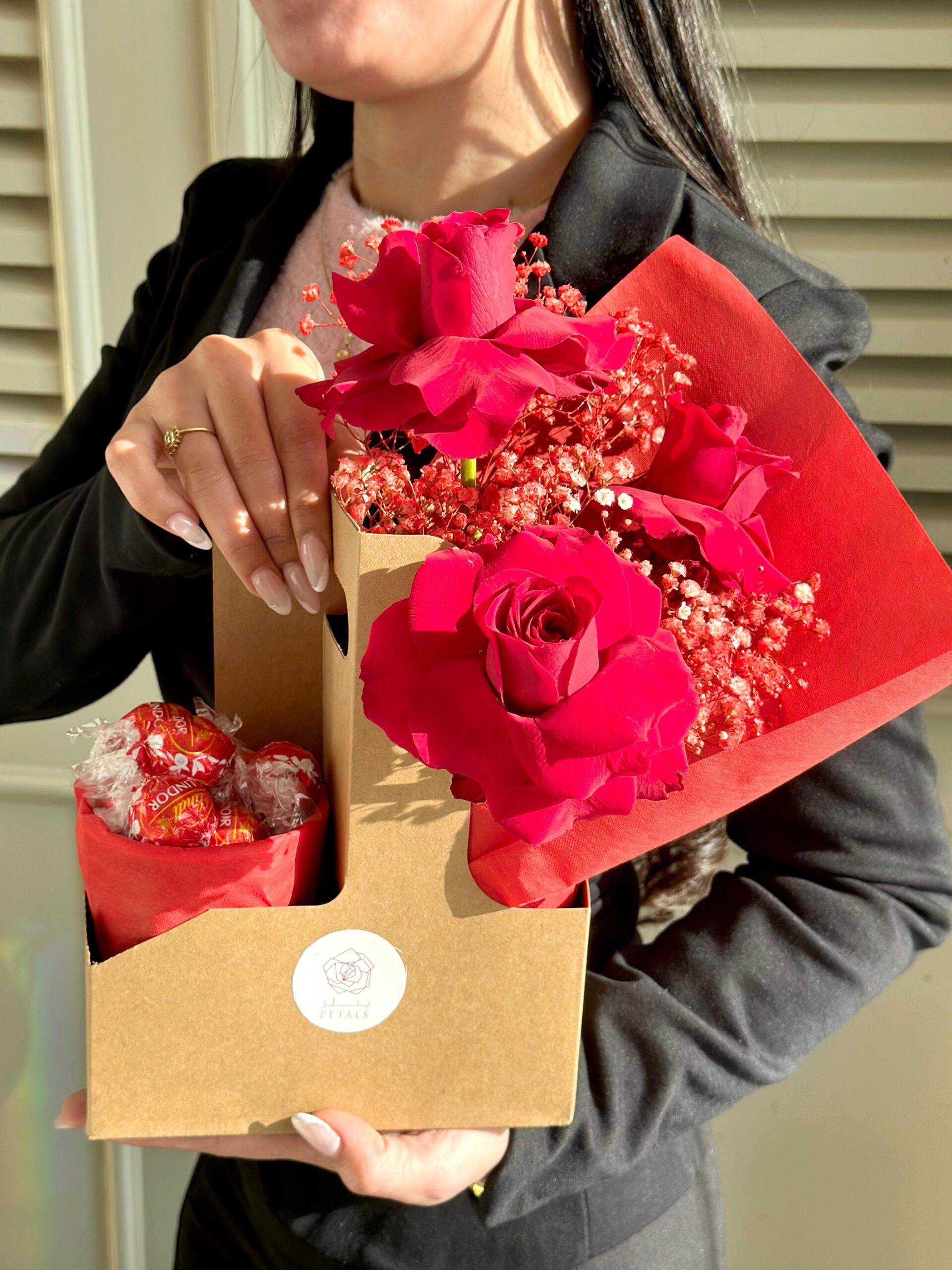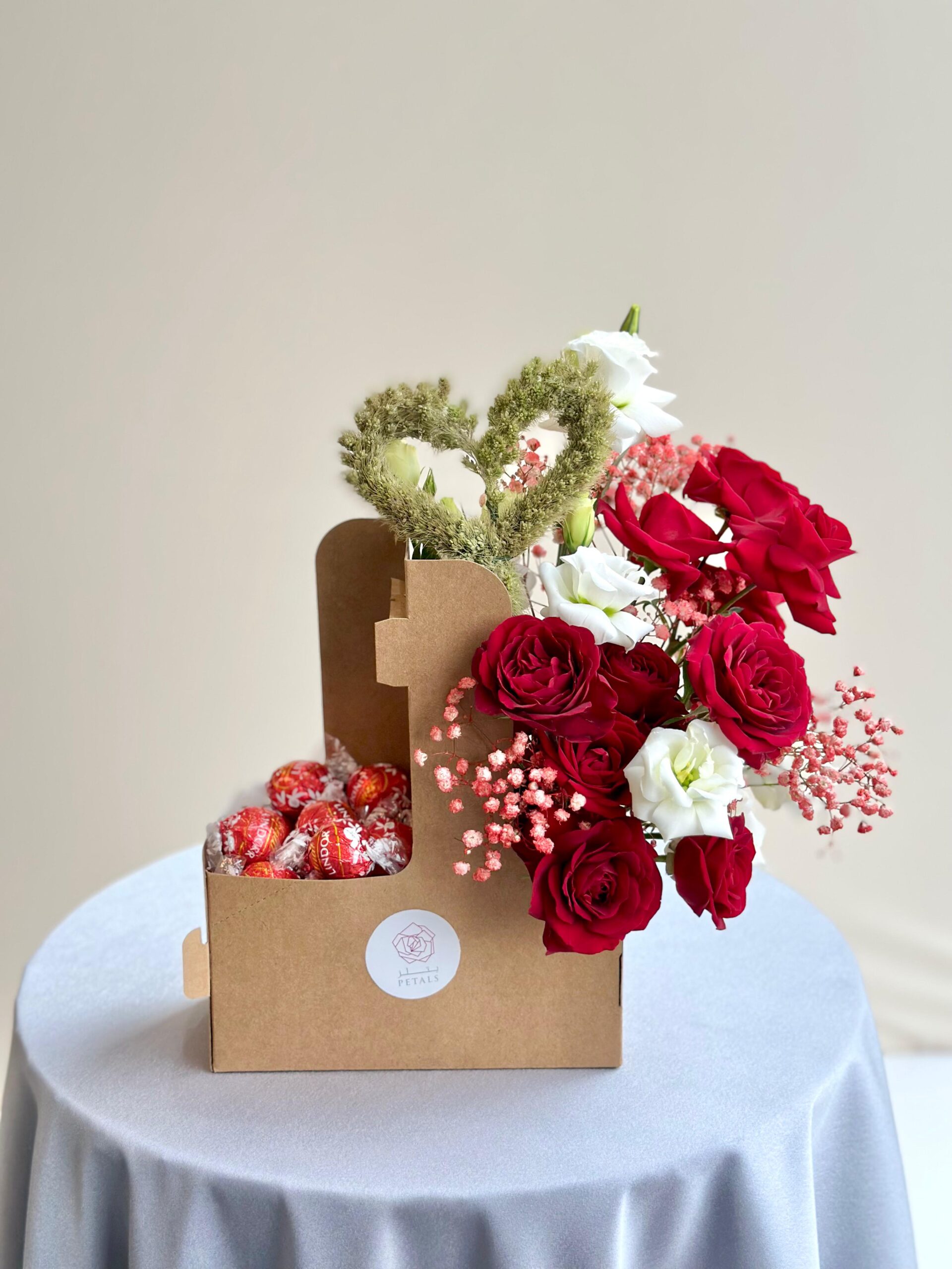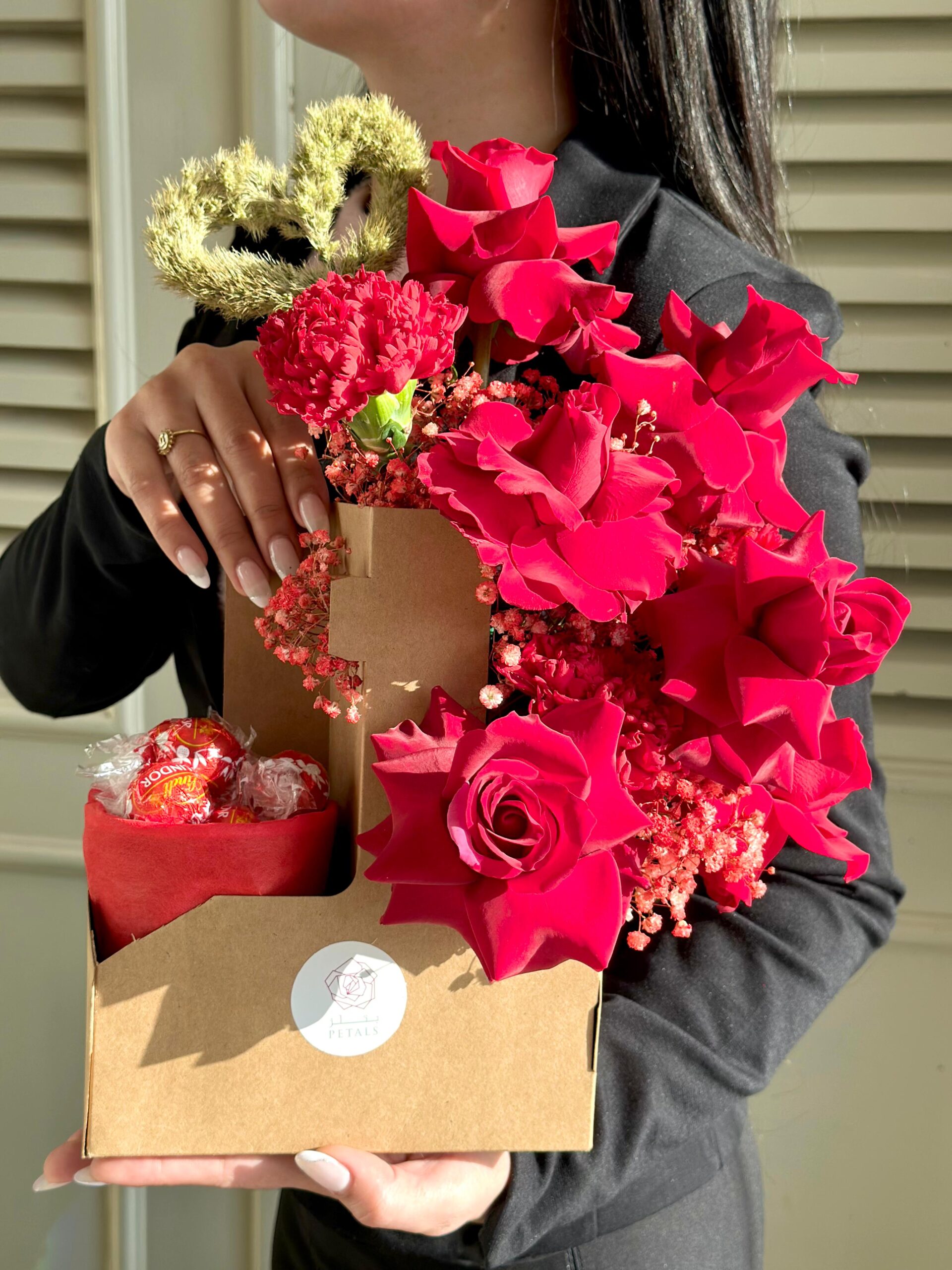 A lush heart of red roses softly embraced by pink accents, wrapped in modern elegance.